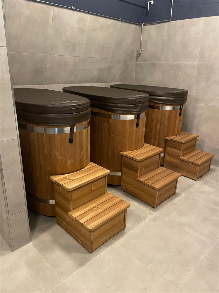 Oval hot tub meant to be filled with cold water in order to cool oneself down after, for instance a trip to the sauna. Drainage hose, water level 20cm from the edge, volume about 490 liters.