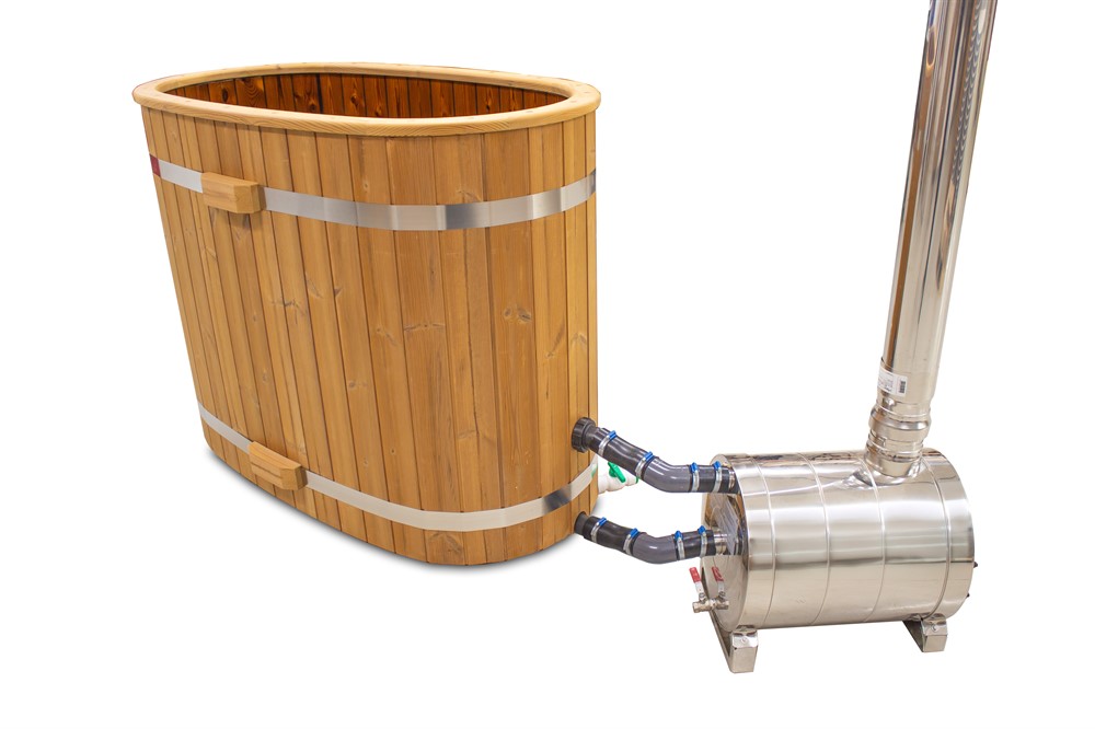 Ovaali muovitettu kylpytynnyri 2 istuimella. Täytetään vedellä esim. puutarhaletkulla. Lämmitetään ulkopuolisella puulämmitteisellä kamiinalla (sisältyy). Ala ja yläliitosputki kamiinalle sekä tyhjennysletku sisältyy. Helppo tyhjennys hana ja letku. Vesimäärä 20 cm yläreunasta n. 490 litraa.